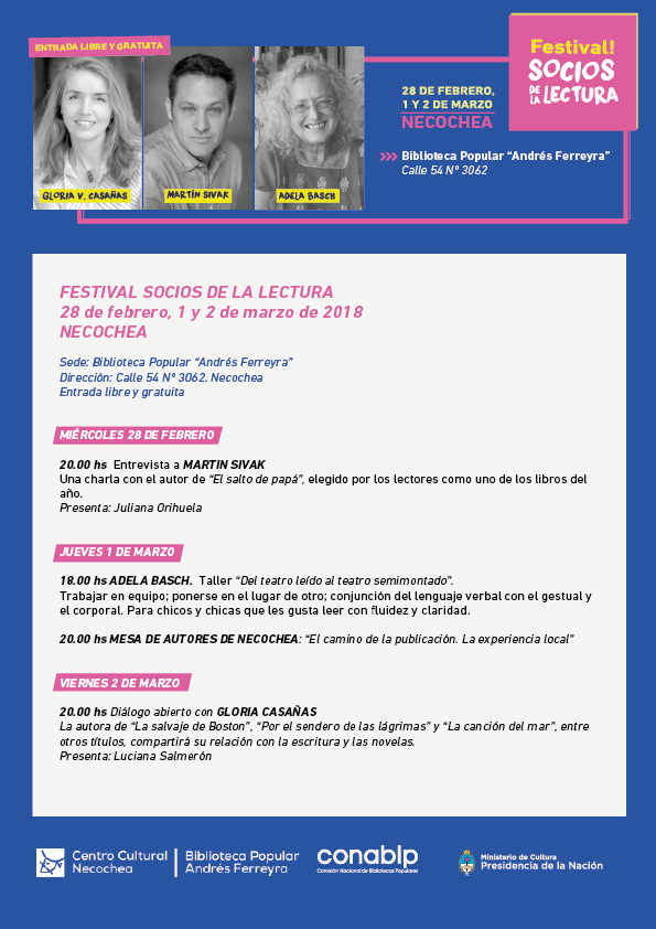 La CONABIP junto con la Biblioteca Popular Andres Ferreyra llevarán adelante otra edición del Festival “Socios de la lectura” que convoca a autores, actores, divulgadores de ciencias y artistas de diferentes disciplinas quienes dan su testimonio, comparten sus experiencias personales vinculadas a las bibliotecas e invitan al público a sumarse como socios. Con entrada libre y gratuita, la cita será los días miércoles 28 de febrero, jueves 1 y viernes 2 de marzo en sede de la biblioteca.