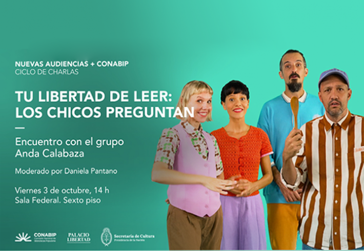 La Secretaría de Cultura de la Nación, a través de la Comisión Nacional de Bibliotecas Populares (CONABIP), continúa con el ciclo de charlas "Tu libertad de leer". Mañana, viernes 3 de octubre, a las 14 horas, el Salón Federal del Palacio Libertad se llenará de música y fantasía con la presentación del grupo Andá Calabaza.