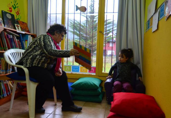 Abuelas leecuentos leen a lxs chicxs que visitan el Rincón Infantil.