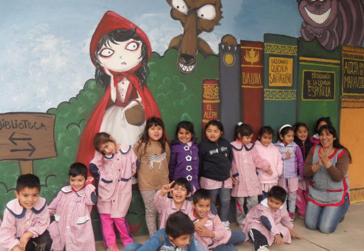Niños y docente durante la Maratón de lectura, disfrutando del mural que está al costado del...