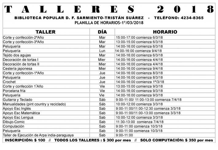 LOS HORARIOS DE LOS TALLERES DE LA BIBLIOTECA 2018.