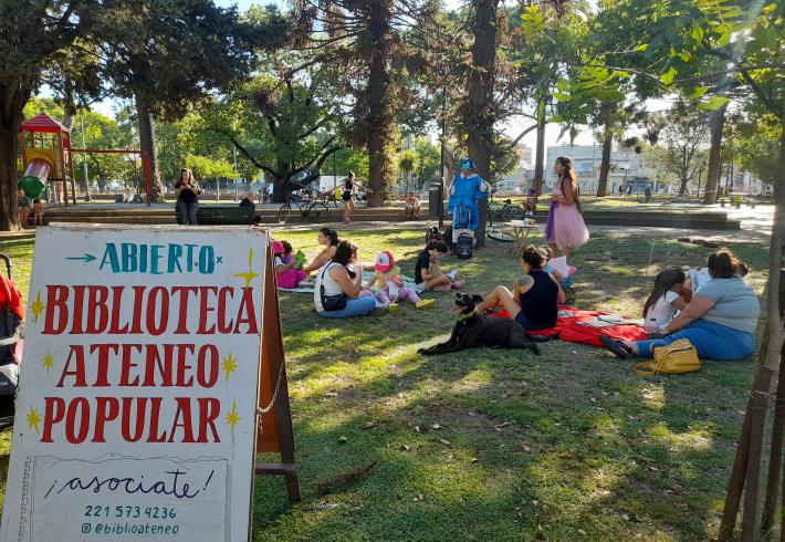 Desde 2019 la biblioteca se muda algunas tardes de verano a Plaza Alsina, para compartir un momento...