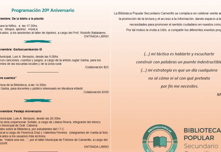 En esta próxima semana la BIBLIOTECA POPULAR SECUNDARIO CARNERILLO celebra el 20º Aniversario, con...