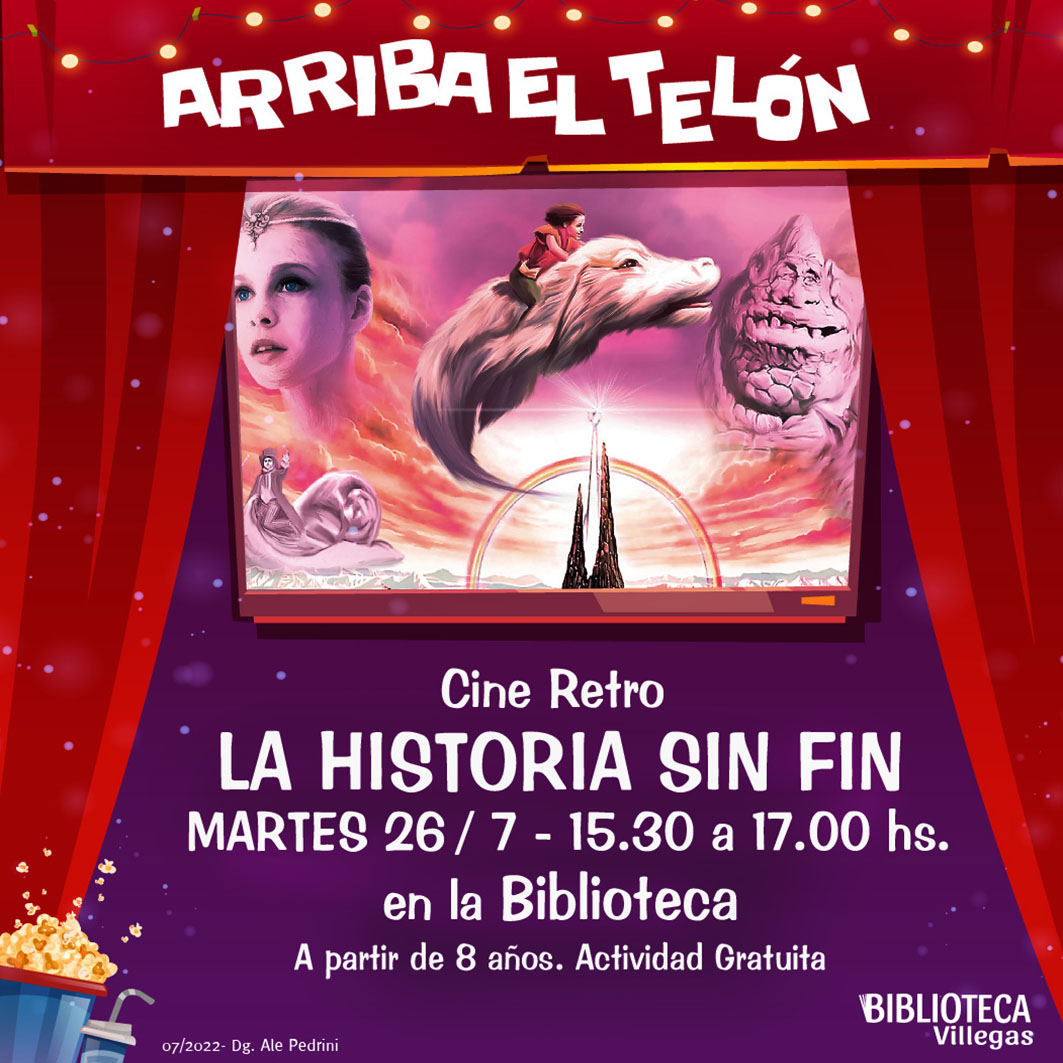 VACACIONES EN BIBLIOTECA: ¡ARRIBA EL TELÓN! En vacaciones de invierno, la Biblioteca levanta el telón y la Fantasía sale a escena. El martes 26 de 15.30 a 17.00 hs, te proponemos cine de alto vuelo para viajar a los 80s con "La historia sin fin". La inolvidable obra de Michael Ende, convoca a nostálgicos y a quienes quieran descubrir el poder de la fantasía. A partir de 8 años. [Actividad gratuita]