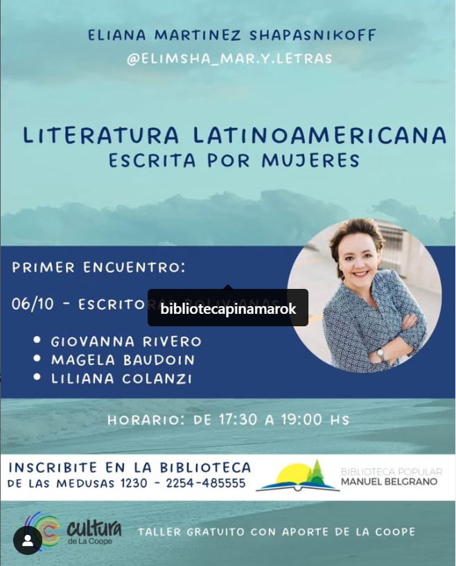 El 6 de octubre a las 17:30 hs comienzó el taller "Literatura Latinoamericana escrita por mujeres" en la Biblioteca Popular Manuel Belgrano de Pinamar.