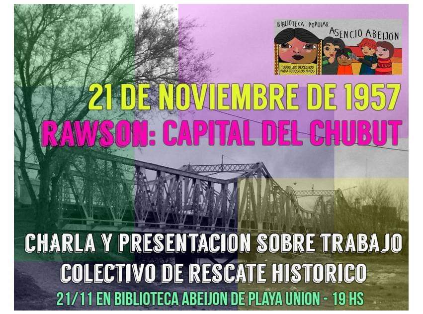 Una charla abierta a la comunidad para divulgar la marcha de una propuesta de rescate histórico sobre Rawson se realizará este miércoles 21 de noviembre, a partir de las 19, en la Biblioteca Popular “Asencio Abeijón” de Playa Unión.