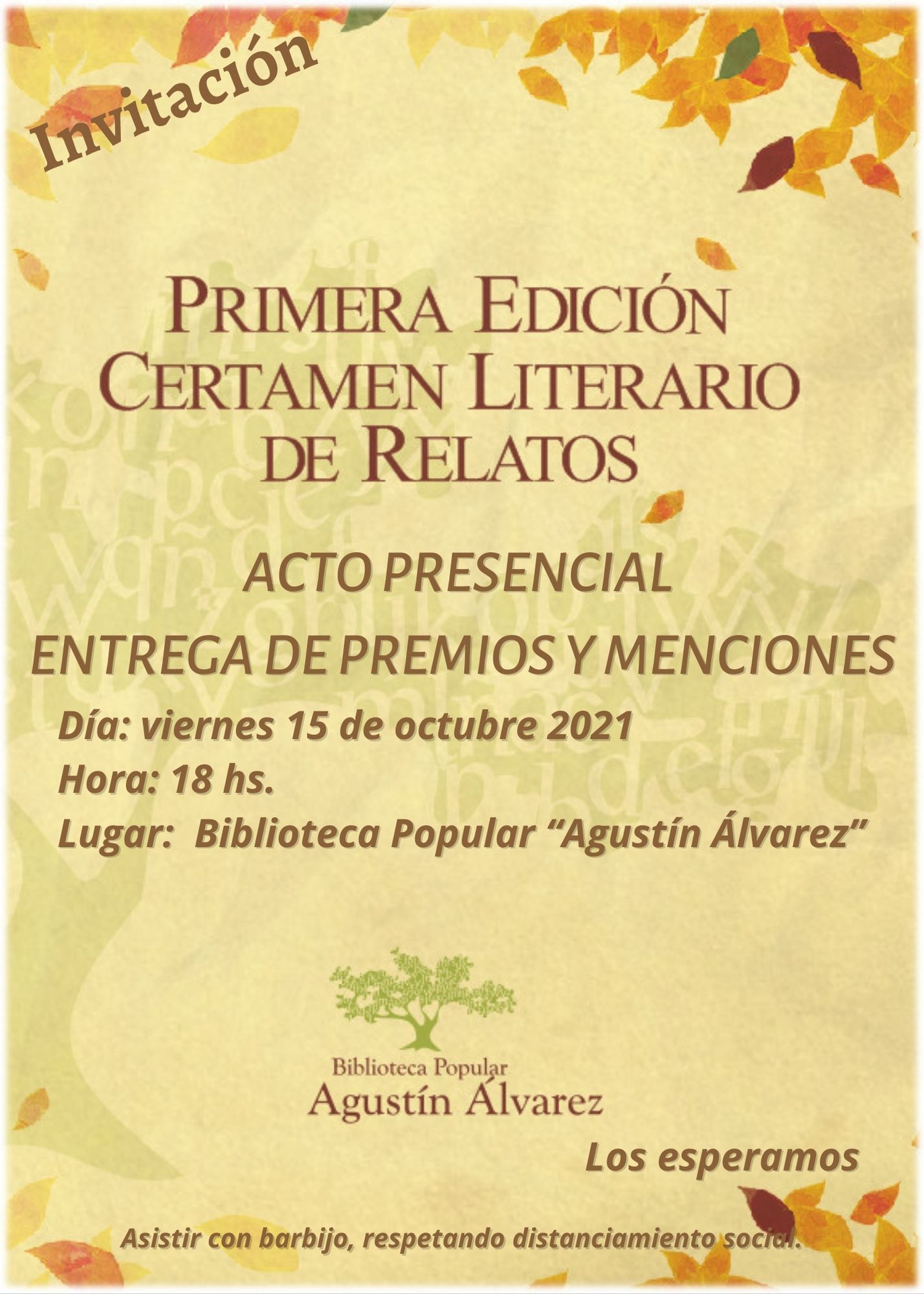 Este viernes, 15 de octubre a las 18:00 horas, tendrá lugar la entrega de premios y menciones de la Primera Edición del Certamen Literario de la Biblioteca Popular “Agustín Álvarez” on-line. Se celebrará en forma presencial, con todos los cuidados que implica la situación de pandemia sanitaria. Están todos invitados.