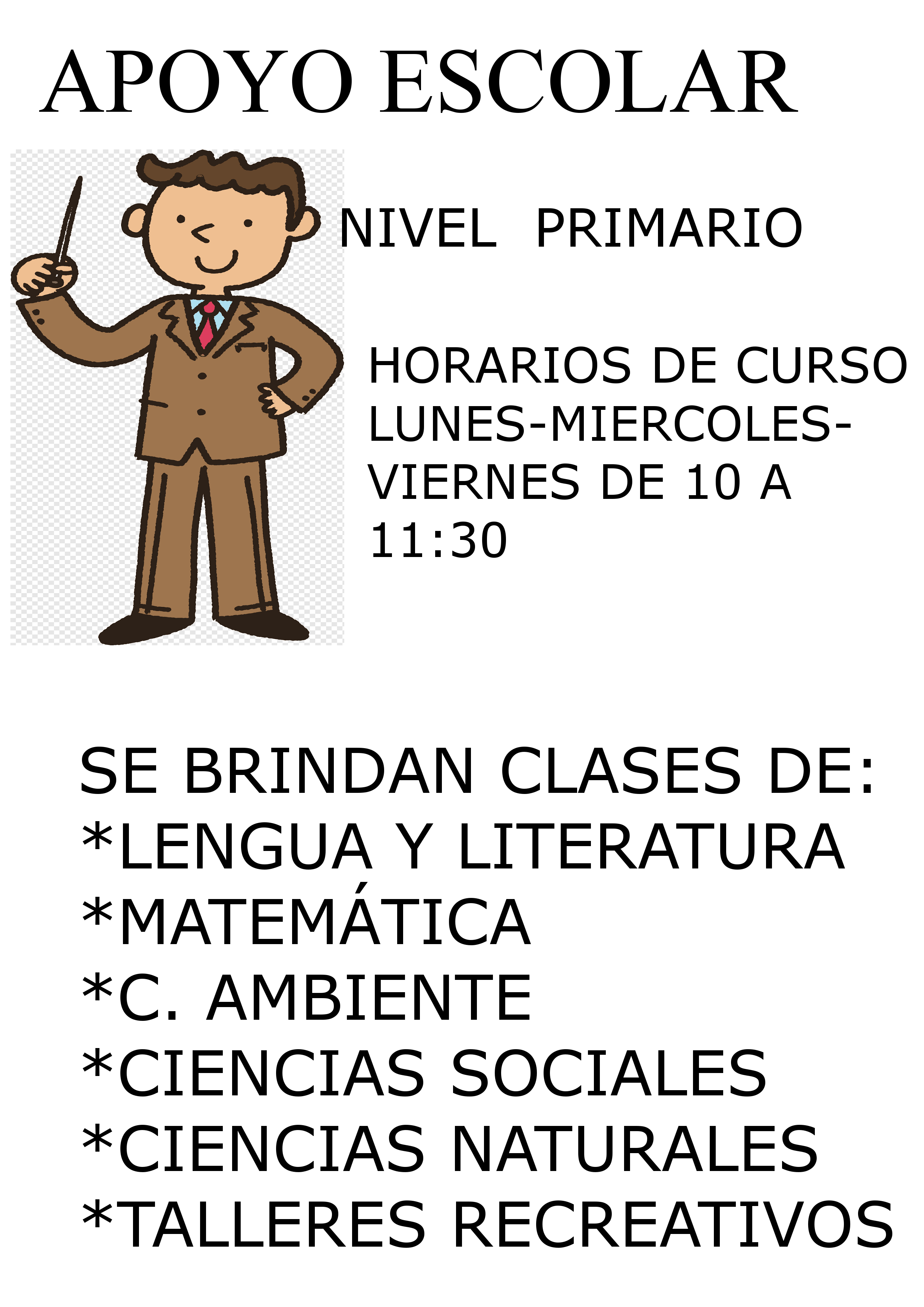 La Biblioteca Popular Francisco Peñasco ofrece clases de apoyo escolar los días lunes, miércoles y viernes de 10:00 a 11:30 para todos los niños que requieran ayuda con clases de apoyo.