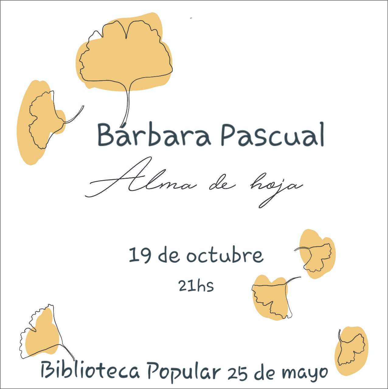 La Comisión Directiva de la Biblioteca Popular "25 de Mayo", invita a la presentación de "Alma de Hoja", el nuevo proyecto musical de la cantante Bárbara Pascual. La misma tendrá lugar en la sede de la Biblioteca, el sábado 19 de octubre a las 21 horas.