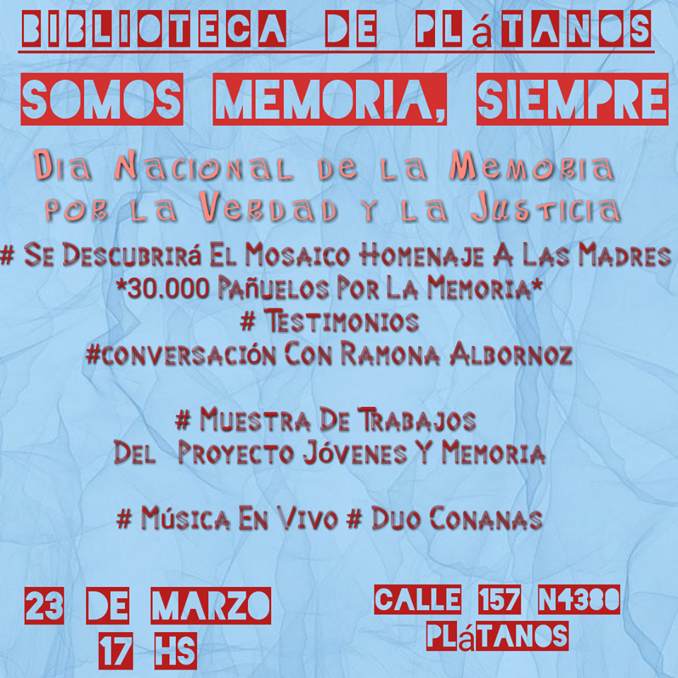 El Día Nacional de la Memoria por la Verdad y la Justicia es la denominación que se adoptó en el año 2001, con el que se designa en Argentina al 24 de marzo, la conmemoración del aniversario del golpe cívico-militar del año 1976, y donde se recuerda al terrorismo de Estado, los crímenes de lesa humanidad cometidos por la dictadura y a los 30 000 detenidos desaparecidos.
