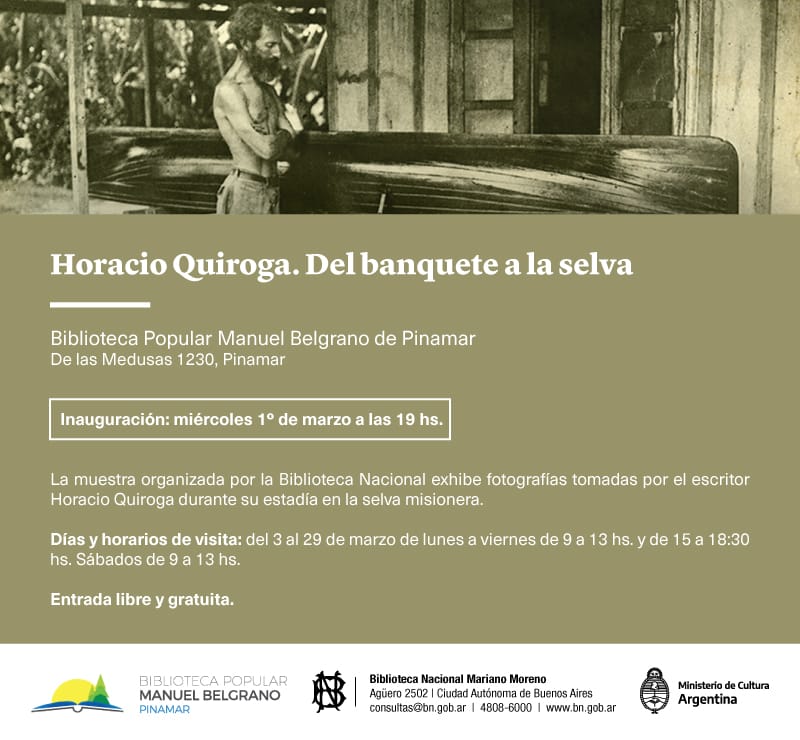 Muestra itinerante "Horacio Quiroga. Del banquete a la selva. Fotos de una vida" La exhibición, organizada por la Biblioteca Nacional, presenta fotografías tomadas por el escritor Horacio Quiroga durante su estadía en la selva misionera.
