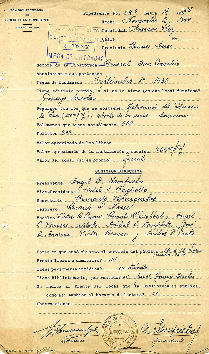 La Biblioteca General San Martín está afincada frente a la plaza principal de Marcos Paz (una ciudad de la provincia de Buenos Aires que se niega a perder su ritmo bucólico). Fundada en la década del 30 por ilustres vecinos que le dieron una impronta iluminista se fue transformando, en los albores del siglo XXI, en un espacio abierto, plural y de vanguardia para toda la comunidad. Actualmente quienes abren sus puertas todos los días la consideran un espacio para promover el saber, democratizar la información, fomentar la creatividad y “generar sensibilidades”.