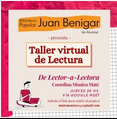 La pandemia y la imposibilidad de reunirse en forma física no fueron causa para suspender la actividad. Este taller De lector(a) a Lector(a) se desarrolla desde hace 8 años y tiene una importante respuesta de asistentes que disfrutan de la lectura compartida. A través de la plataforma meet de google, se llevan a cabo todos los jueves los encuentros virtuales para leer. Algunos de los autores y géneros leídos: