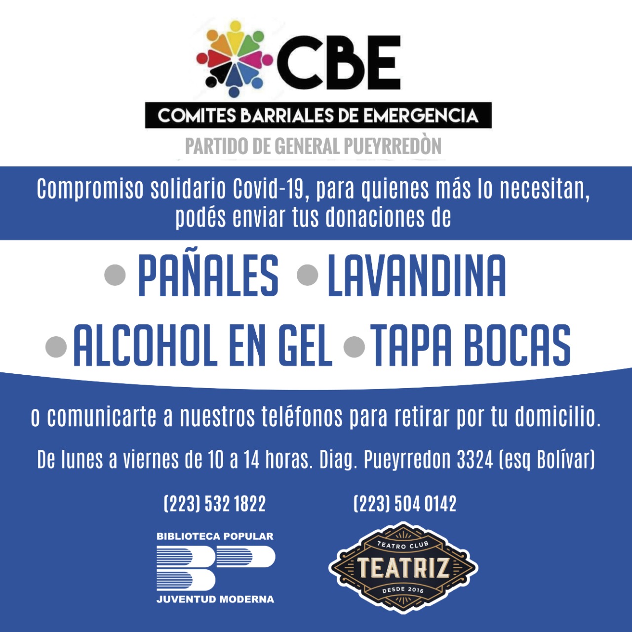 La histórica biblioteca popular organiza una campaña solidaria y convoca a los vecinos marplatenses a donar barbijos, tapabocas, lavandina, alcohol y pañales. Los insumos son distribuidos en los barrios carenciados de la zona.