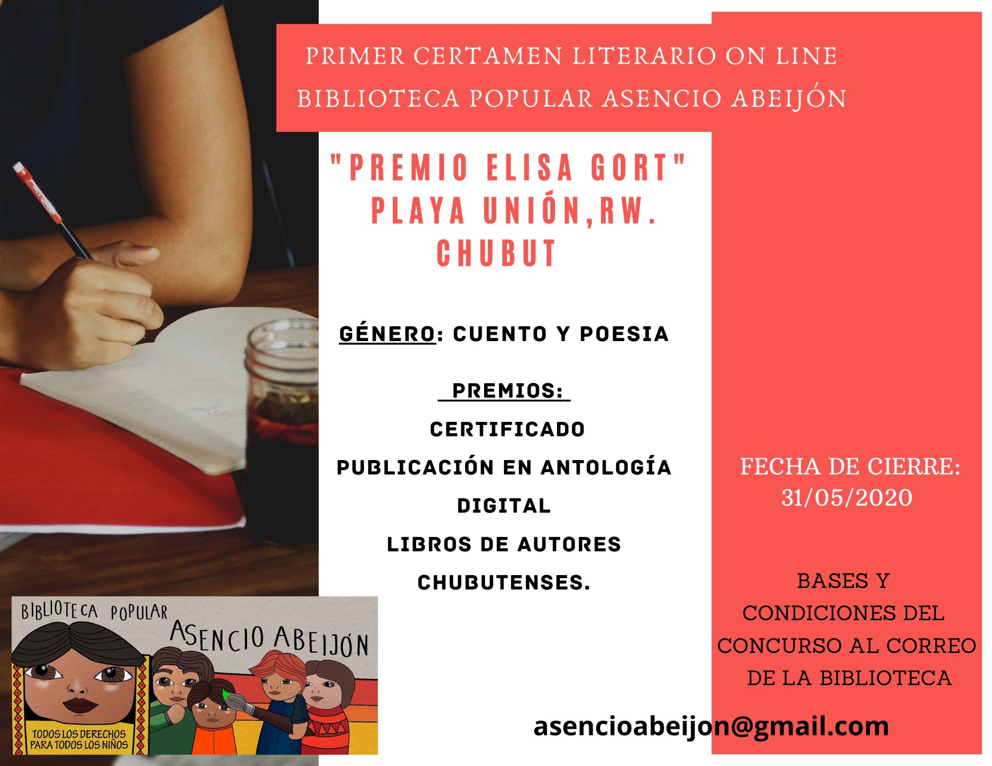 En el mes de abril, Aniversario 29º de la Biblioteca Popular Asencio Abeijon, y en el marco de la pandemia que nos obliga a cuidarnos unos a otros permaneciendo en aislamiento social, la Biblioteca Popular Asencio Abeijón de Playa Unión lanzo un Certamen Literario On Line "Premio Elisa Gort". El mismo está dedicado para los géneros de cuento y de poesía. El cierre de admisión de trabajos fue el 31/05/20. Actualmente el jurado compuesto por el Escritor, Poeta y Periodista Sergio Pravaz y las escritoras Adriana Rodrigues Sousa y Patricia Arza, han terminado con la deliberación consignando 1er, 2do, y 3er Premio; y 1er, 2da y 3ra Mencion de Honor para ambas categorias, contabilizando un total de 12 premiaciones, de un total de 38 trabajos presentados bajo seudónimo. En palabras del jurado, "ha sido un arduo trabajo y una reconfortante alegria desarrollar esta actividad que ha tenido tan exquisitas producciones; pero había que elegir y fue ahí donde se afino el lápiz y se respetaron las consignas establecidas en las bases". El Primer Premio es un cuadro del gran artista plástico, Ariel Testino, un certificado de participación con copia de la Declaración de Interés Municipal, la publicación del trabajo premiado en una Antología digital y libros de autores chubutenses. Se desarrollara la entrega de Premios de manera excepcional, el próximo 17 de julio, por categoría y sin publico presente, resguardando las medidas sanitarias establecidas por protocolo de acuerdo a la fase en la que nos encontramos en la ciudad. Luego será retransmitido vía redes sociales. Durante estos días se estará notificando a participantes y ganadores/as, de acuerdo a lo previsto en las Bases del Concurso. Para mayor información, consultar al mail de la biblioteca: asencioabeijon@gmail.com