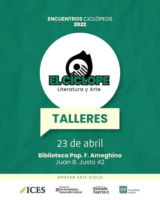 ¡ATENCIÓN AMIGOS DE EL CÍCLOPE! Este sábado 23 a las 16 se realizará el primer encuentro de los talleres que coordinan quienes hacen este ciclo: El Eternizador (Taller de Lectura), Desde el Sótano (Taller de Escritura y Peña de Lectura) y Palabrelío (Taller de Escritura). La invitación es tanto para los asistentes que ya tengan alguna experiencia previa como para el público en general, porque la idea es hacer una demostración de cómo es la dinámica de los talleres. Se van a desarrollar diferentes tipos de actividades y, como siempre, cada uno puede traer su mate y sus ganas de experimentar la literatura desde distintos ángulos. Todo el universo invitado a otra fecha del ciclo más bello de la comarca, en nuestra Biblio, por supuesto!