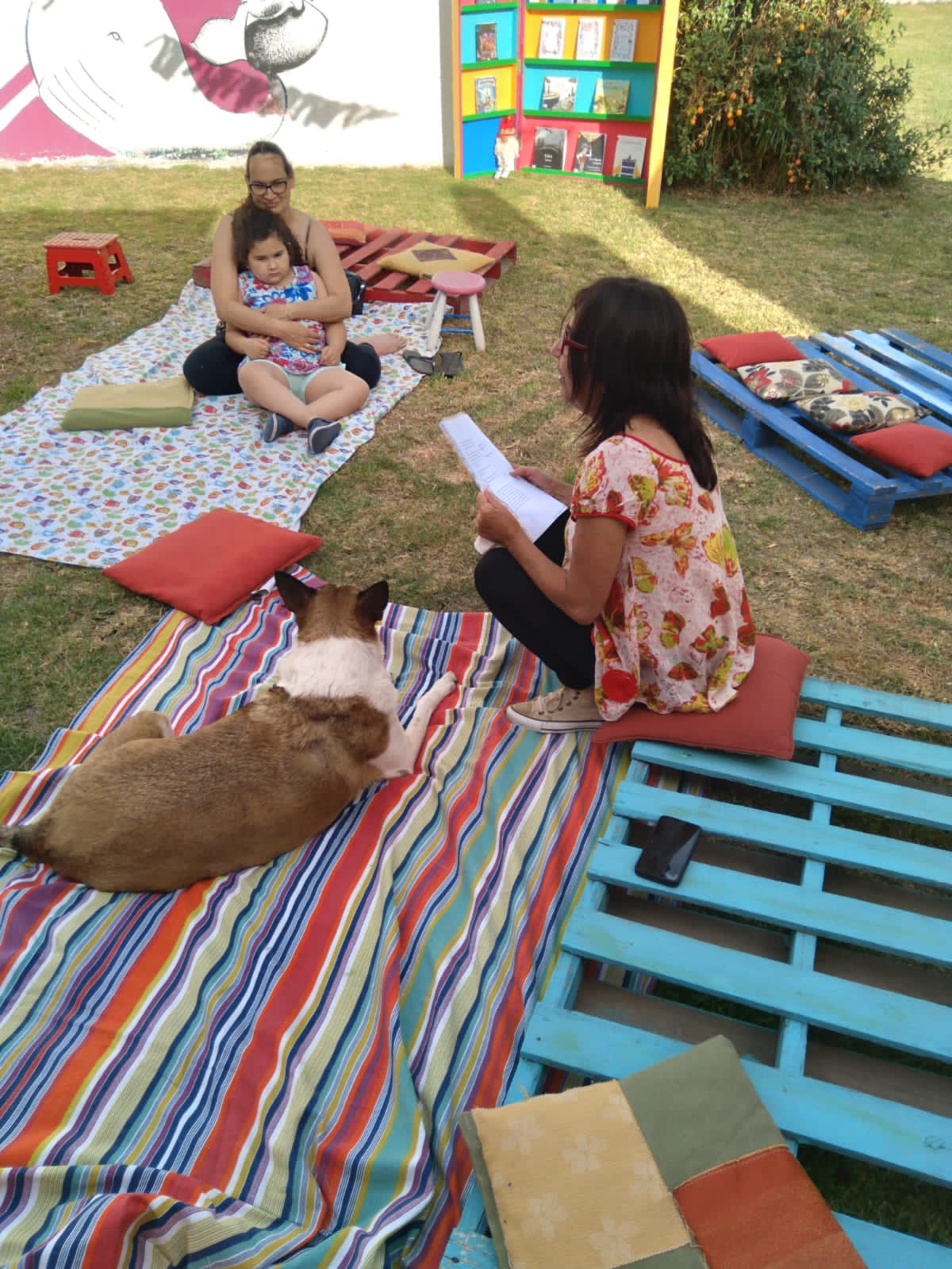Luego de conversar sobre las actividades virtuales que hemos llevado adelante durante el año: (Ciberbiblioteca, Cibercaminata por la lectura), de las presenciales al aire libre (visitas de instituciones educativas, invitaciones a participar de eventos), de las novedades relacionadas con la ampliación de la Sala de Lectura Graciela Cabal y de la ambientación de la futura Bebeteca en la casilla rodante, disfrutamos de la narración de dos textos: “Tortita de manteca”, leído por Susana Jaime y el primer capítulo de “Juanita Libertad”, por Marita Halty. Además grandes y chicos leímos “Rimas”, de Franco Vaccarini, un libro rueda realizado por Mechi Gómez.