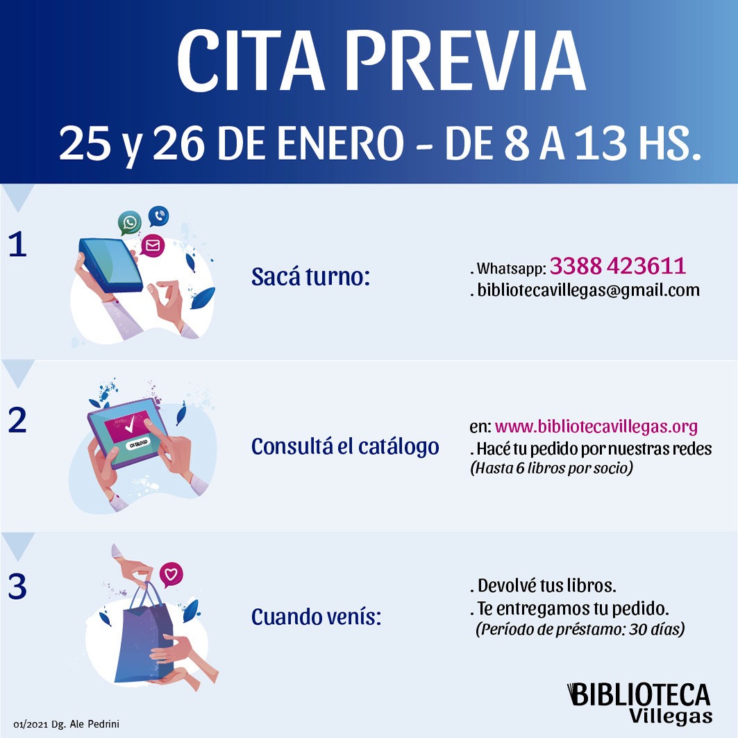 La biblioteca recibirá el día lunes 25 y martes 26 de enero devoluciones de libros y entregará en préstamo los libros solicitados al momento de pedir el turno. La atención será por turno previo que se sacará por whatsapp al teléfono 3388 423611, por mensaje en facebook, instagram o correo electrónico.