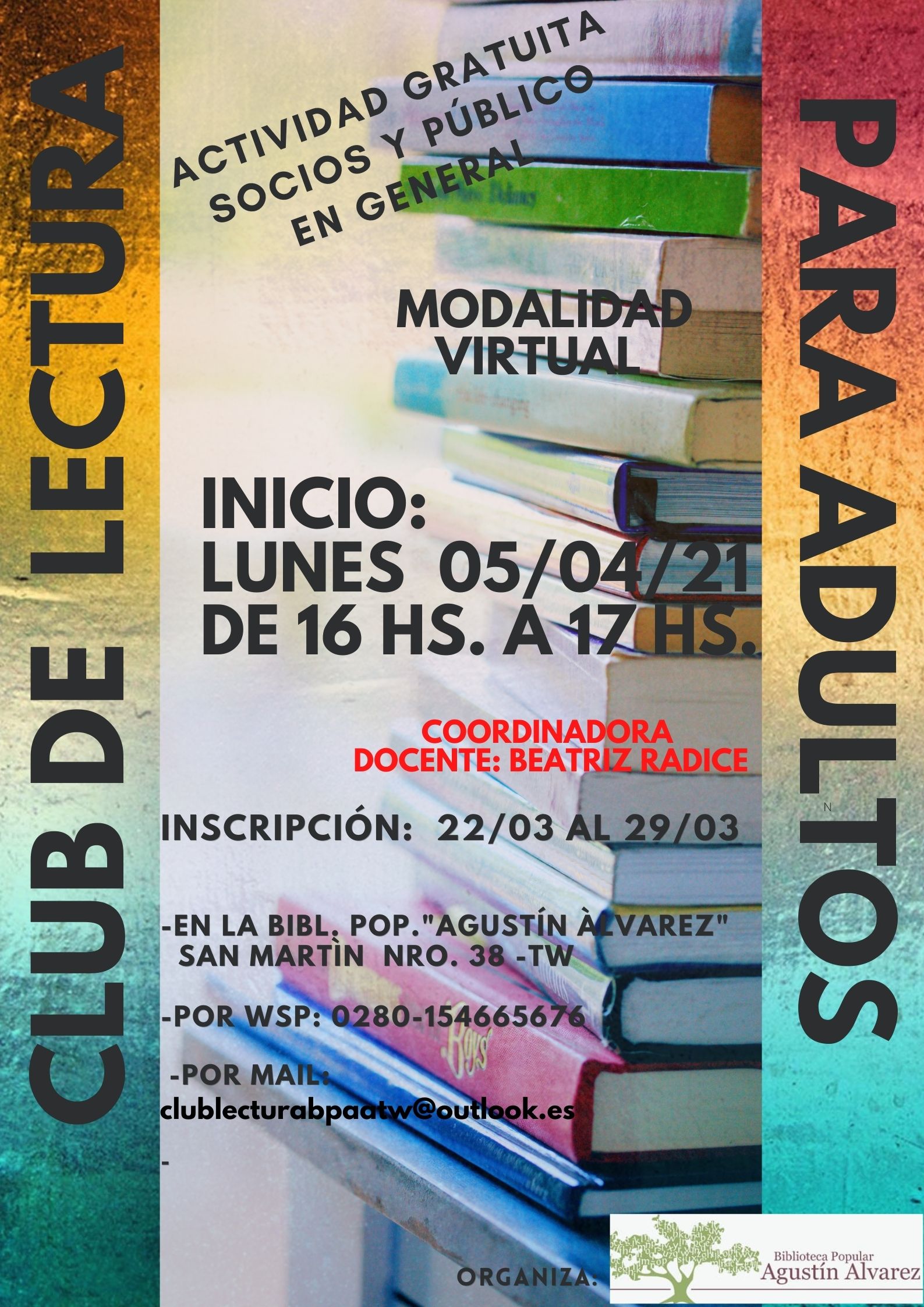 Expertos o no en cuanto al hábito de la lectura… ¿No saben por dónde empezar? ¿qué leer? No se preocupen: Les ofrecemos un espacio como guía para leer, debatir y compartir lecturas: CLUB DE LECTURA DE ADULTOS - modalidad virtual.