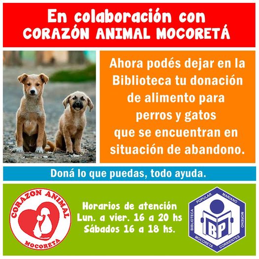Desde la Biblioteca y como parte del Proyecto de Información Ciudadana, no solo informamos sobre la tenencia responsable, cuidados, castración para evitar la superpoblación, también ofrecemos nuestro espacio para que los ciudadanos puedan dejar donaciones de aliementos y así ayudar a animales enm situación de abandono.