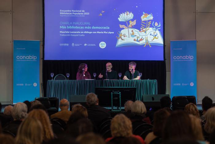 A continuación, tuvo lugar la primera charla del encuentro: un conversatorio entre Maurizio Lazzarato, filósofo y sociólogo italiano residente en París, con traducción de Ezequiel Gatto, y a la escritora María Pia López que llevó por título: Más bibliotecas más democracia: Desafíos para un nuevo humanismo y una nueva construcción de lo común. Una reflexión sobre los compromisos que requieren nuestros tiempos.
