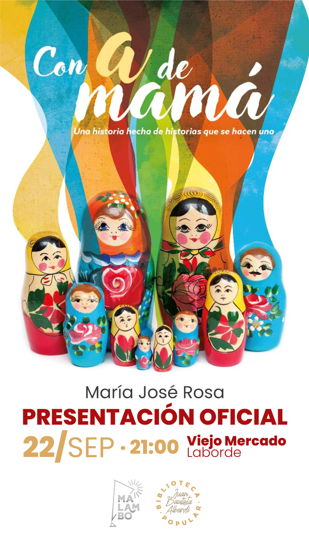 BP JUAN BAUTISTA ALBERDI| Presentacion oficial del libro Con a de mamáSE realizará la Presentación oficial del Libro Con a de mamá de la escritora labordense María José Rosa. Es su primer libro realizado y es usuaria de la BP. Se llevarán adelante apreciaciones desde su trabajo en la construcción del mismo y se dará la oportunidad de realizar intercambios con el público. Se firmarán ejemplares y se sorteará uno entre los presentes.