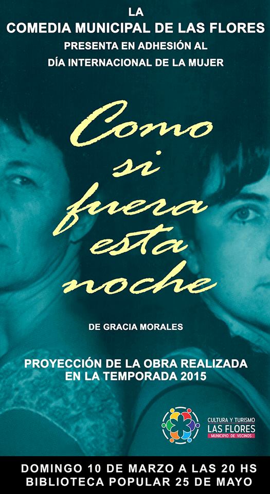 Proyección de la obra "Como si fuera esta noche", estrenada por la Comedia Municipal en la Temporada 2015, protagonizada por Elisa Fullone y Agustina Martines Berecoechea, bajo la dirección de Susana Rizzo, vestuario y maquillaje Rosa Mantovano y Graciela Rizzo, Iluminación y musicalización Darío Molina. Como si fuera esta noche nos propone sumergirnos en un mundo mágico, un mundo que, traspasando todas las barreras temporales, permite en un salto de casi dos décadas, un encuentro fugaz entre madre e hija. Esta historia, usando la cotidianidad y el lirismo, trata de mostrar un fragmento de una realidad que cada vez mas visible: la de la violencia contra las mujeres y sus consecuencias. La proyección se realizará el domingo 10 de marzo, a las 20 hs, en la Biblioteca Popular 25 de Mayo, en el marco de las actividades programadas con motivo del Día Internacional de la Mujer.
