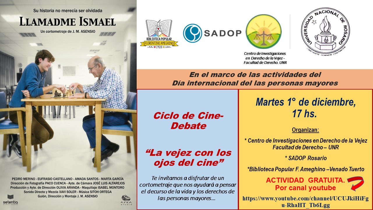 En el marco de las actividades del Día Internacional de las Personas Mayores, los invitamos a ver el cortometraje "Llamadme Ismael", un film del Ciclo Cine-Debate "La vejez con los ojos del cine". Organizado por el centro de Investigaciones en Derecho de la vejez, la Facultad de Derecho U.N.R., S.A.D.O.P. Rosario, y nuestra querida Biblio, a través del Taller de Estimulación para la Memoria, el cual funciona en nuestra institución hace 10 años.