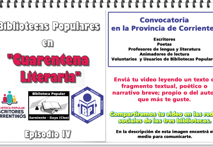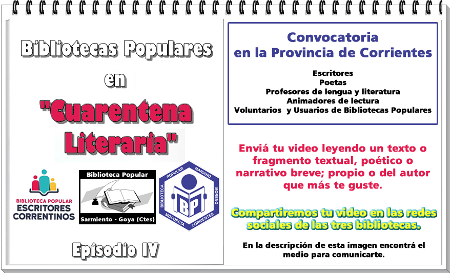 A iniciativa de la Biblioteca Popular Escritores Correntinos, la Biblioteca Popular Sarmiento, y la Biblioteca Popular Mariano Moreno fueron invitadas a formar parte del Proyecto "Cuarentena Literaria", la misma consiste en compartir, difundir a travéz de las redes sociales videos leyendo un texto o fragmento textual, poético o narrativo breve, propio o del autor que más le guste.