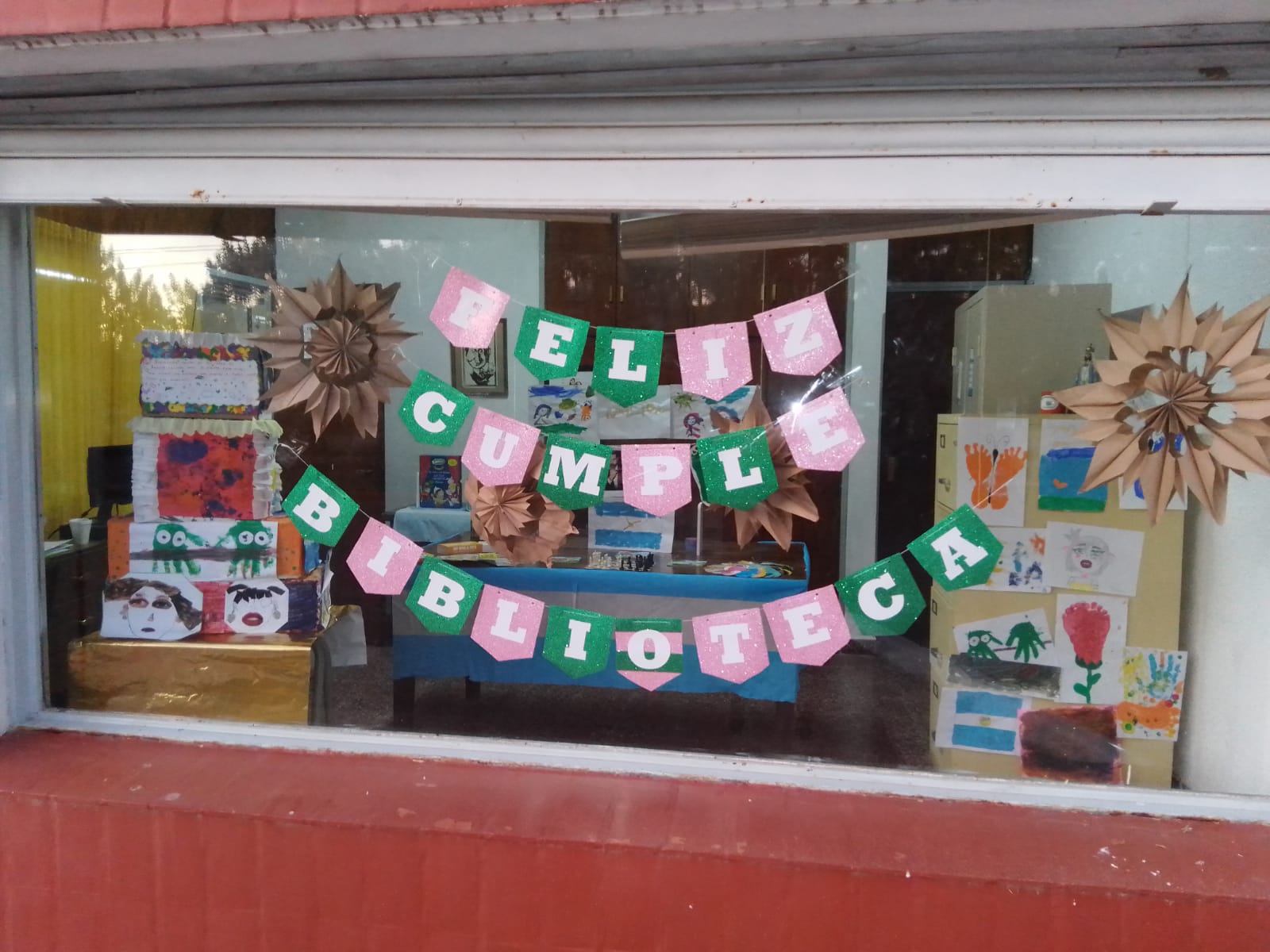 Vidrieras alusivas una realizada por los niños del taller lúdico, y otra de una joven socia