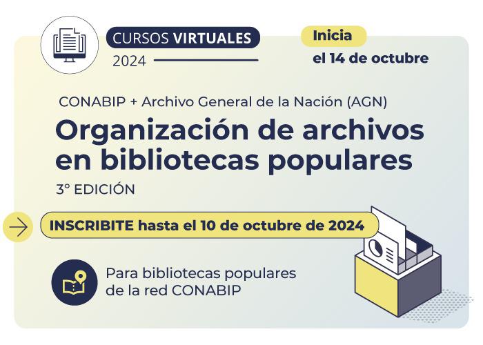 Este curso tiene por objeto que quienes desarrollan tareas en bibliotecas populares tengan los conocimientos iniciales para poder comenzar un adecuado tratamiento de sus archivos. La correcta identificación, clasificación, descripción, preservación, digitalización y posibilidad de acceso a sus fondos documentales ampliará el acceso ciudadano a la documentación, serán fuente de conocimiento, soporte de derechos, parte de la memoria institucional y contribuirán a las tareas de arraigo de la biblioteca en la comunidad como actora de la vida social, educativa y cultural del lugar donde se encuentra.