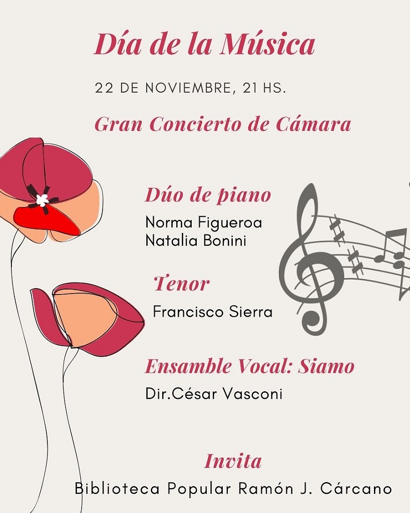 Evento por el día de la música, a realizarse el día 22-11-2019, 21Hrs, en las instalaciones de la biblioteca popular Ramón J. Cárcano - Bell ville - Córdoba.