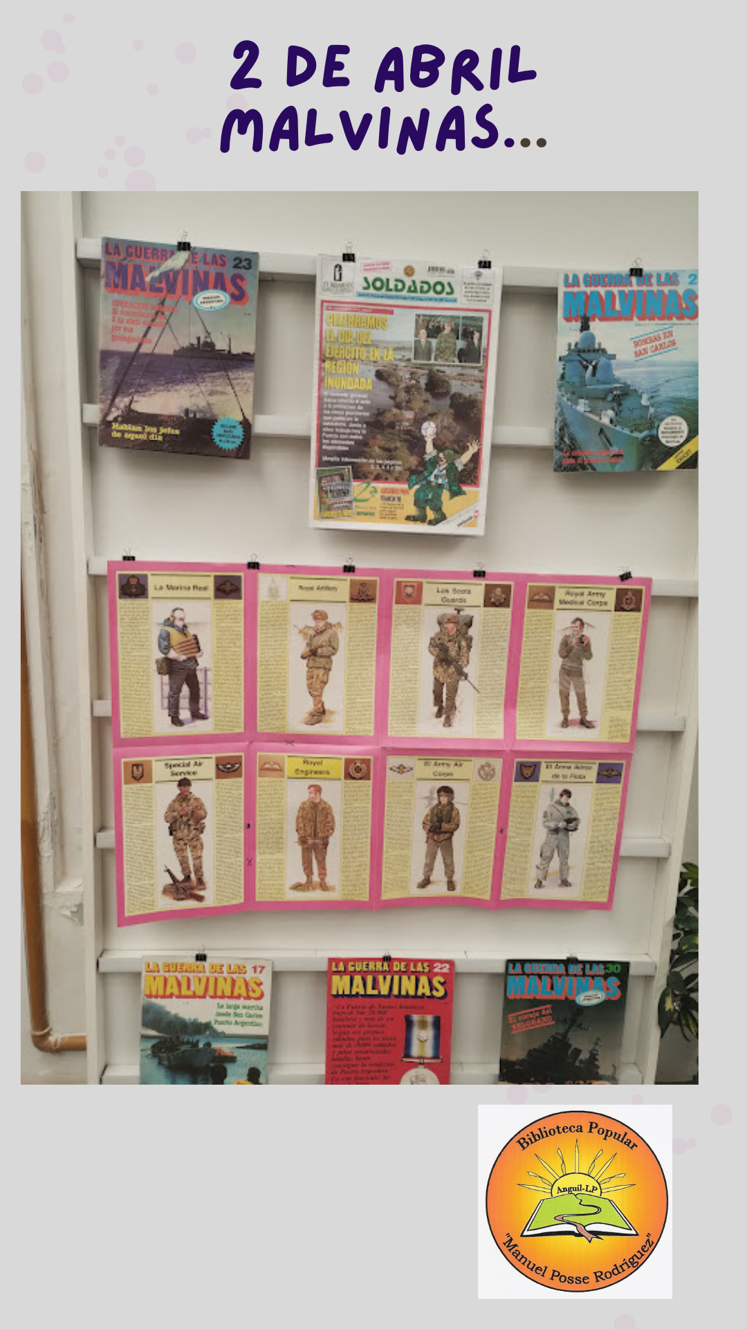 Exposición de revistas, libros y láminas en el salón de acceso a la Biblioteca Popular "Manuel Posse Rodríguez de Anguil (LP).-