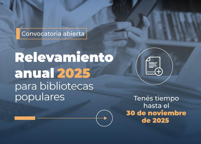 Con el propósito de diseñar y profundizar el lineamiento de la política pública 2025 para continuar acompañando y apoyando el trabajo de las bibliotecas populares en todo el país, la Secretaría de Cultura de la Nación - a través de la CONABIP- convoca a completar el relevamiento anual de las acciones y recursos que ofrece cada biblioteca a su comunidad.