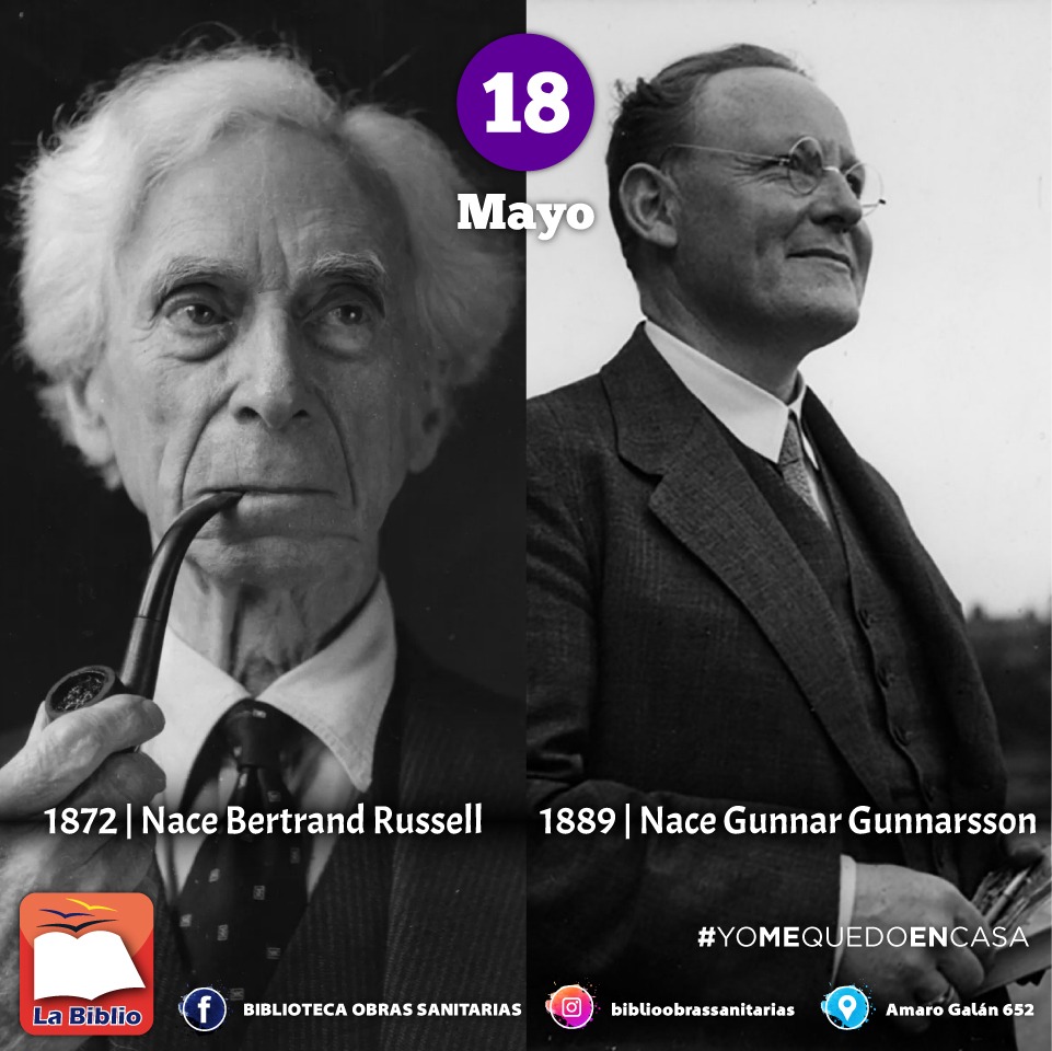 El 18 de Mayo de 1872, nace Bertrand Arthur William Russell, quien fue un filósofo, matemático, lógico y escritor británico ganador en 1950 del Premio Nobel de Literatura. Entre sus obras más notables encontramos: "Los problemas de la filosofía"; "El poder en los hombres y en los pueblos"; "Historia de la filosofía occidental".