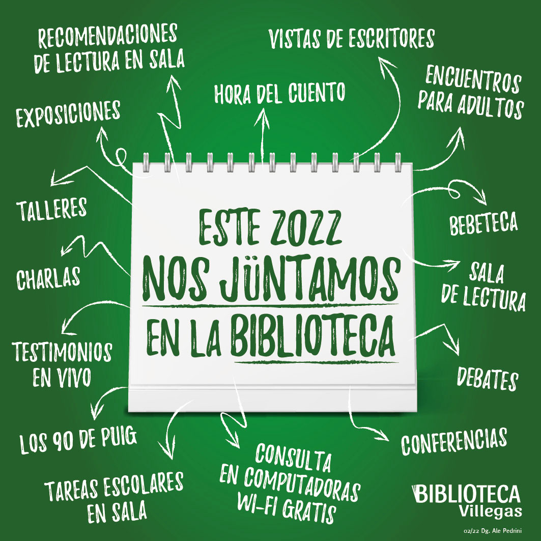 EN 2022 NOS JUNTAMOS EN LA BIBLIOTECA La Biblioteca vuelve a ser el lugar de encuentro de lectores y sus salas se llenarán de historias, palabras y diálogos a través de las actividades planificadas para este año 2022.