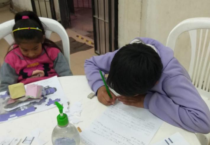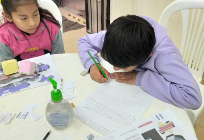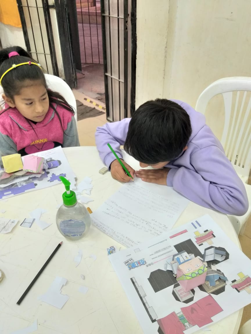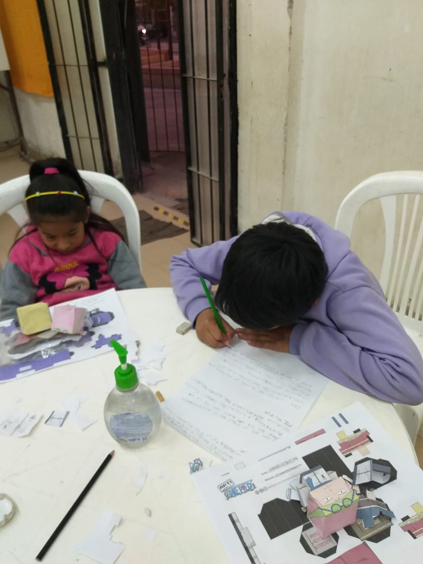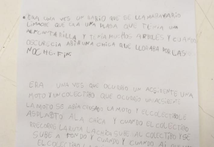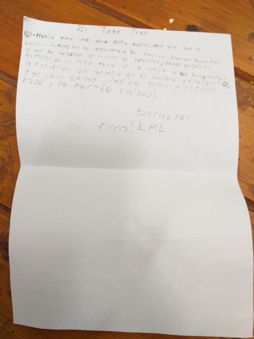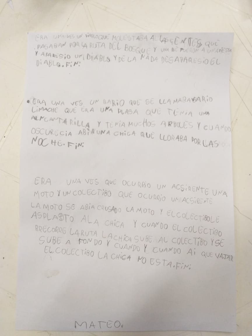 Ese momento de expresarse a través de la escritura .Sea para exteriorizar la imaginación, compartir ideas, sentimientos o bien transmitir algún suceso sobre el cual tomamos conocimiento .Mateo (en la foto) y Mauricio a través de sus escritos plasman cuentos que conocen. Lo valorable también es la espontaneidad con que ha surgido la citada actividad por parte de ellos.