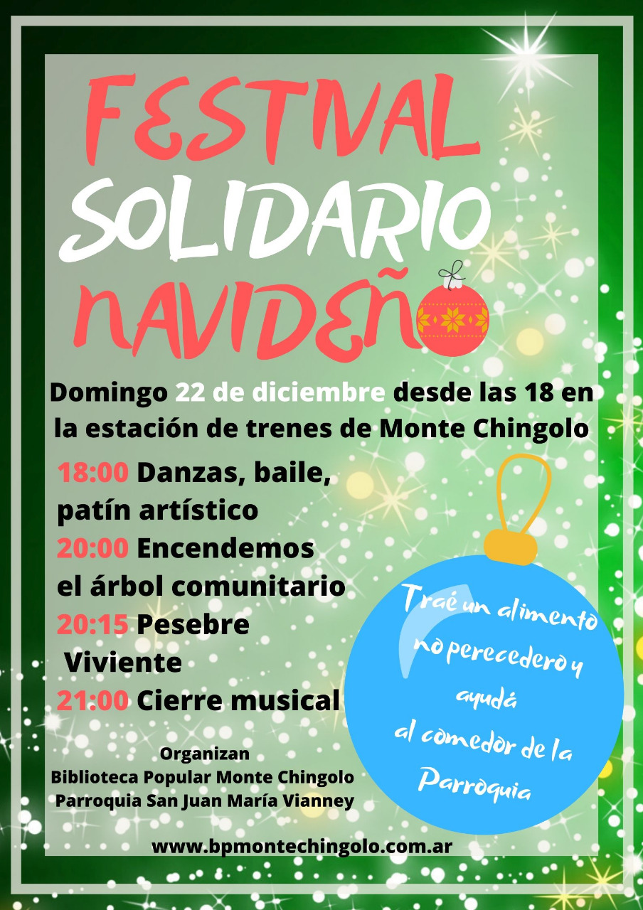 La Biblioteca Popular Monte Chingolo convoca a la comunidad a participar del Festival Solidario Navideño a beneficio del comedor de la parroquia San Juan María Vianney y la celebración del tradicional Pesebre Viviente comunitario que se realizará el próximo domingo 22 de diciembre desde las 18 en la antigua estación de trenes de Monte Chingolo.