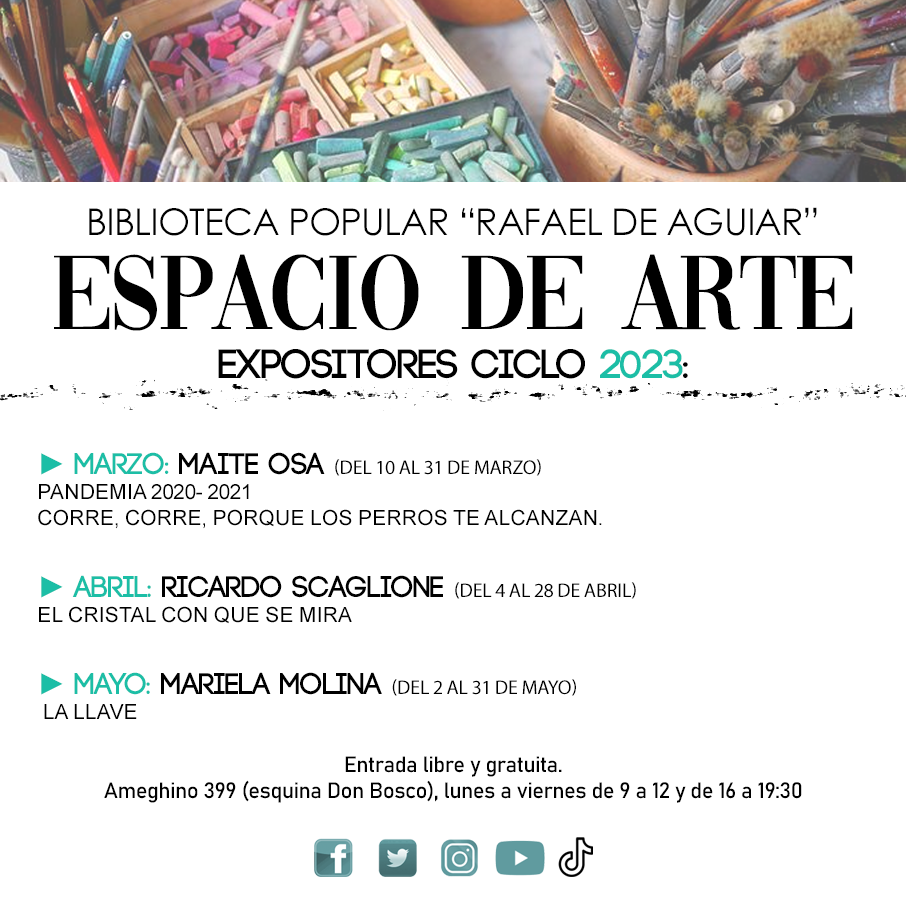 La Biblioteca Popular “Rafael de Aguiar” realizará la inauguración de su nuevo Espacio de Arte para expositores el viernes 10 de marzo a las 19:30 en su sede central de Ameghino esquina Don Bosco. El proyecto se inició luego de recibir una colaboración por parte de Ternium, quien organizó una Gala de la Camerata Bariloche en el Teatro Municipal de nuestra ciudad. Todo lo recaudado en la ocasión fue donado a la Biblioteca con motivo de cumplirse el setenta y cinco aniversario de su fundación. Dicho monto se destinó a dos proyectos. El primero, el aislamiento de humedad de la sala Juana Couretot de Guella, en donde se encuentra el Tesoro Bibliográfico (libros que datan del siglo XVIII en adelante). El resto fue utilizado para la refacción del hall de entrada de la Biblioteca, en donde se acondicionó para la creación de un espacio propicio para el encuentro con la lectura y también para el disfrute de obras de arte. Se instaló un riel reforzado para las muestras, el cual, sumado el que se encuentra en el SUM, conforman un lugar para un total de diez obras (o más, dependiendo si es mediano o pequeño formato) de cada artista que desee exponer. Sabiendo que la demanda es cada vez mayor, surge este espacio como una forma de visibilizar a los artistas locales y de la región. Promocionar obras de arte supone expandir los límites de la biblioteca y brindar a la comunidad un recorrido dentro del circuito cultural, generando una interacción entre los distintos lenguajes. Las muestras se abren a dibujo, pintura, grabado, fotografía y escultura (este último caso sólo si el artista provee de sus propios soportes). Por tanto, a fines de 2022 se lanzó la convocatoria para todo aquel artista nicoleño o de la zona que desee exponer en las instalaciones, sin importar su trayectoria. Se lo presenta como un espacio para ampliar el panorama de la ciudad, para que tanto artistas consagrados como estudiantes de arte puedan tener la posibilidad de mostrar sus creaciones de manera libre y gratuita. Para tal fin, los interesados deben seguir los puntos de una guía que brinda la institución antes de poder postularse para la agenda 2023. Dicha guía se encuentra disponible en papel en la sede de la Biblioteca, o también se puede solicitar por mensaje privado a través de las redes de Facebook e Instagram de la Biblioteca (@bibaguiar) La inauguración del día viernes se realizará con la primera muestra de la artista nicoleña Maite Osa. Se titula “PANDEMIA 2020- 2021. Corre, corre, porque los perros te alcanzan.” Dicha muestra estará montada durante todo el mes, hasta el 31 de marzo. Seguidamente, del 4 al 28 de abril expondrá el artista Ricardo Scaglione con su muestra titulada “El cristal con que se mira.” Y luego, del 2 al 31 de mayo, se contará con las obras de la artista Mariela Molina y su muestra titulada “La Llave.” La entrada es libre y gratuita. Se invita a todos los artistas plásticos de la región a que se acerquen a conocer el espacio para poder formar parte de este nuevo sector de la Biblioteca.