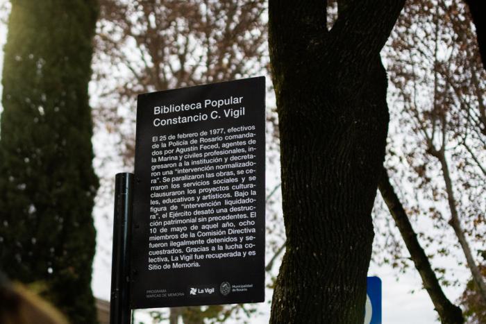 En la jornada se marcaron dos puntos: el ingreso a la biblioteca por calle Gaboto, lugar por el cual el 25 de febrero de 1977 efectivos de la Policía de Rosario, agentes de la Marina y civiles profesionales, entraron al edificio y decretaron una “intervención normalizadora”. Más tarde, el 10 de mayo de aquel año, ocho miembros de la Comisión Directiva fueron ilegalmente detenidos y secuestrados. La otra señalética quedó ubicada en Alem y pasaje Perkins, esquina que fue usada para la quema de los 80 mil libros de la Biblioteca Popular C. Vigil.