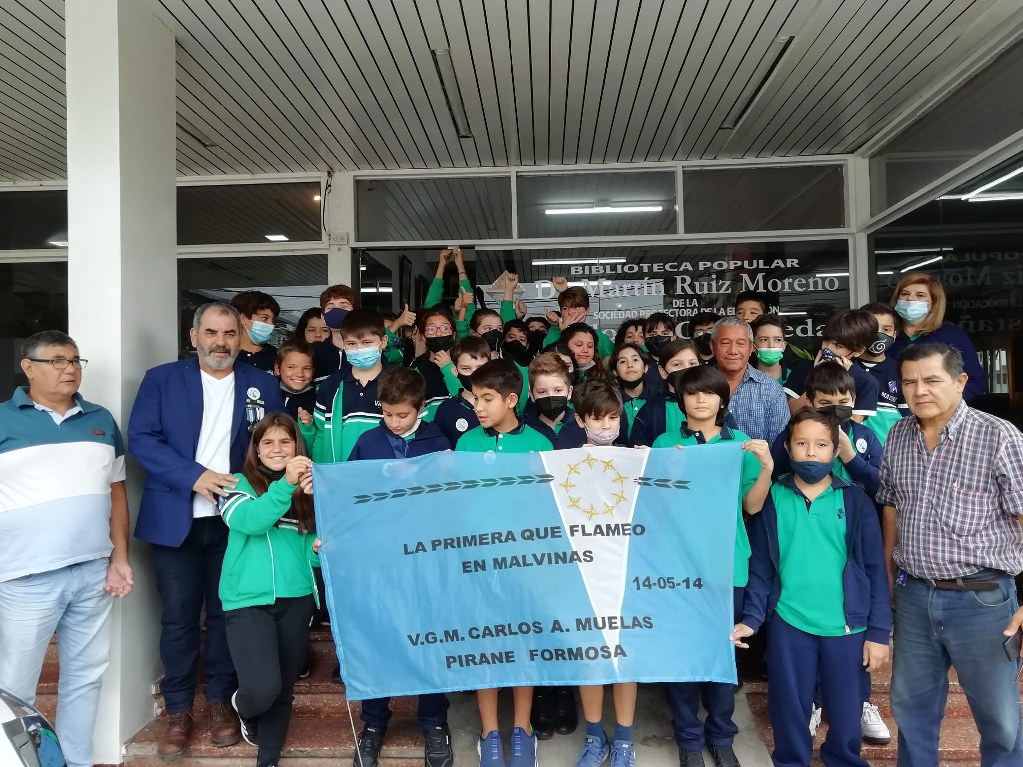 Por último, los estudiantes, docentes, bibliotecarias y veteranos de guerra de Malvinas posaron frente al edificio de la Biblioteca Popular, dependiente de la Sociedad “Castañeda”, con la bandera formoseña que flameó en cielo malvinense, durante una de las visitas del VGM Carlos Muelas.
