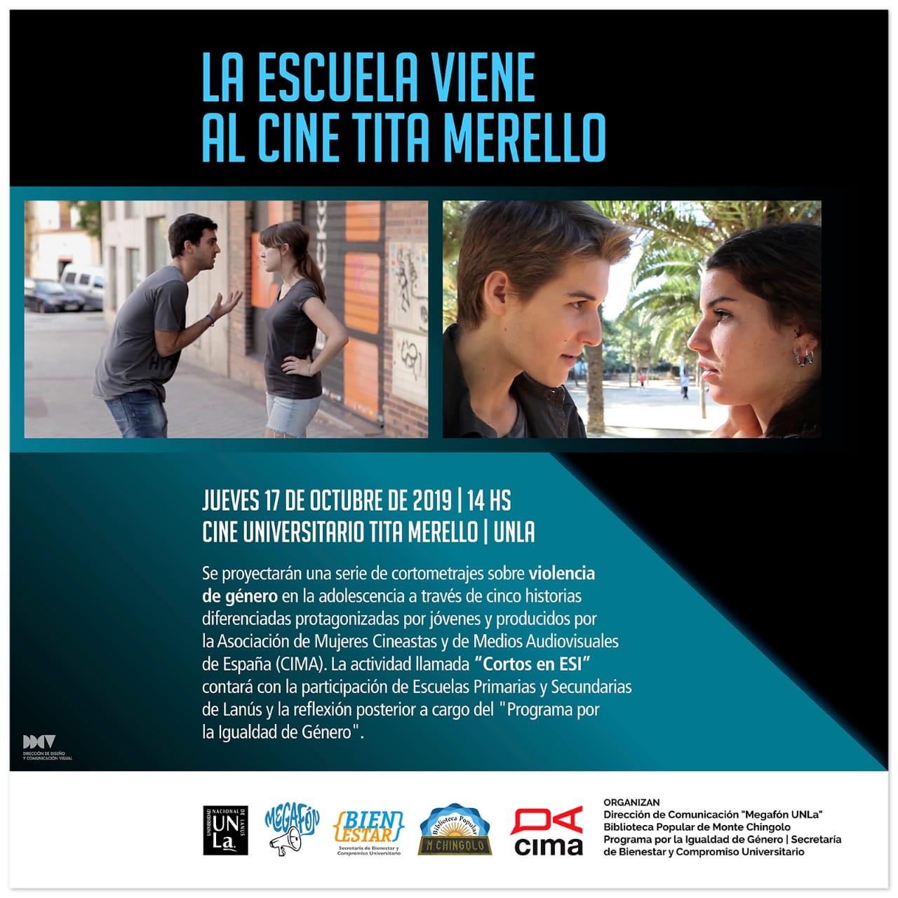 Estudiantes de escuelas públicas de distintos barrios de Lanús disfrutarán este jueves 17 de Octubre de una proyección especial de una serie de cortos audiovisuales en el cine universitario “Tita Merello” de la Universidad Nacional de Lanús (UNLa) que servirán de disparadores para un abordaje de parte de los contenidos de la Eduación Sexual Integral.