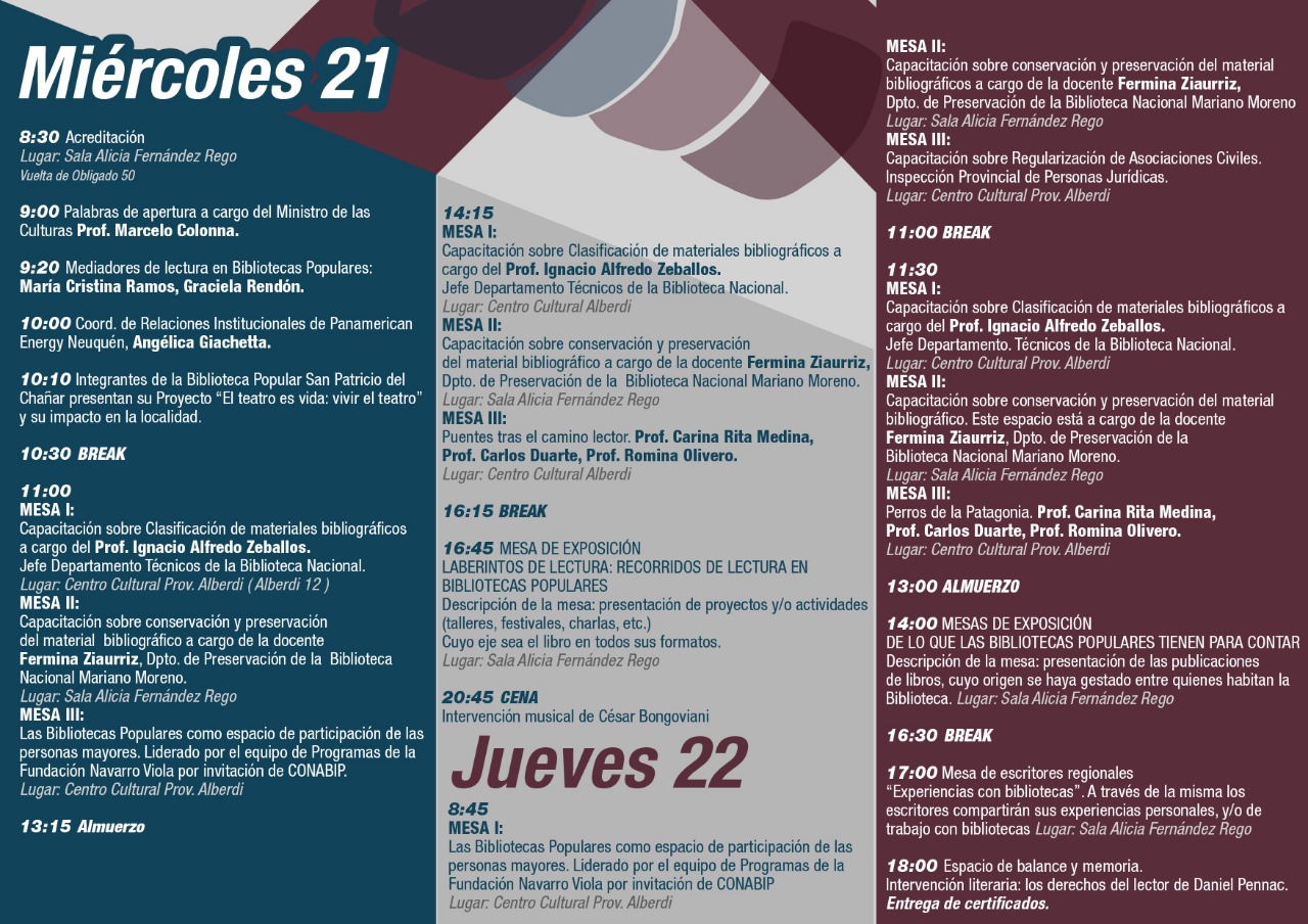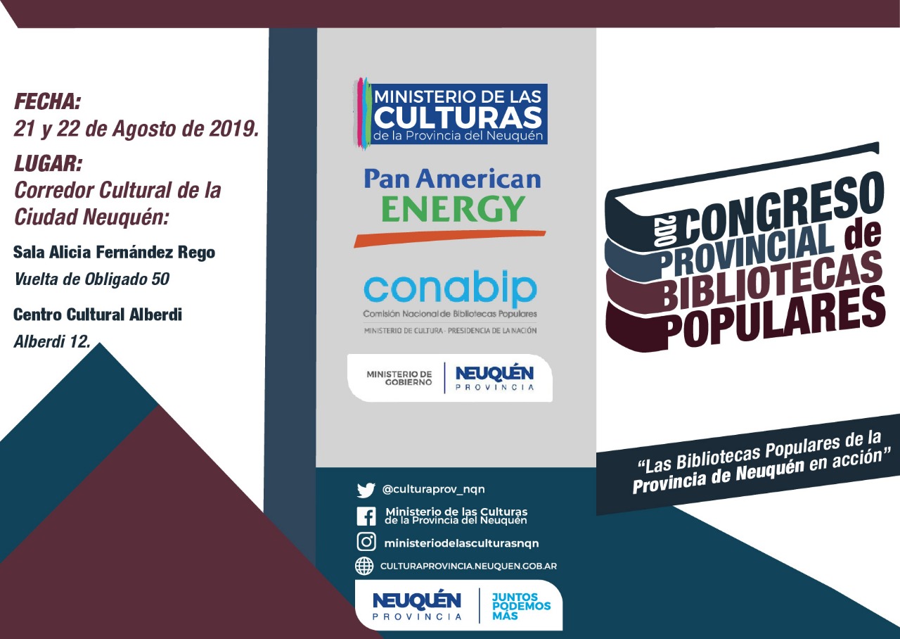 Los días 21 y 22 de Agosto se realizará en Neuquén el 2º Congreso de Bibliotecas Populares que lleva por lema “Las Bibliotecas Populares de la Provincia de Neuquén en acción”. Las jornadas tendrán lugar en el Corredor Cultural de la ciudad Neuquén, Centro Cultural Alberdi.