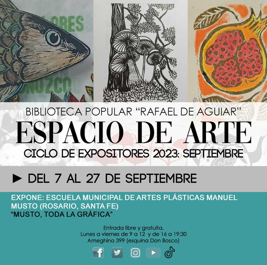 En el marco de su Ciclo de Expositores 2023, la Biblioteca Popular “Rafael de Aguiar” tiene el agrado de recibir a los miembros de “La Gráfica” de la Escuela Municipal de Artes Plásticas Manuel Musto (Rosario). La muestra “Musto, toda la Gráfica” se presentará en su Espacio de Arte, que abarca la totalidad de sus instalaciones tanto en el hall de entrada como el SUM de la institución. La inauguración será el 7 de septiembre a las 18:30 horas, y dicha muestra estará disponible hasta el 27 del mismo mes. En el barrio Saladillo de Rosario, un pintor impresionista llamado Manuel Musto, fallecido en 1940, decidió que cuando él ya no estuviera, su hogar se transformara en una escuela de arte. En 1945 la Musto se inaugura oficialmente como escuela pública. Su nombre completo: Escuela Municipal de Artes Plásticas Manuel Musto. Con el tiempo se transforma en un ejemplo de escuela taller, donde se dejan de lado las jerarquías y los saberes se construyen horizontalmente. Con programas atentos a las necesidades que van surgiendo en tiempos complejos, la Musto ofrece herramientas técnicas y desarrollos conceptuales, acerca la teoría a la práctica y propicia la convergencia entre lo individual y lo colectivo, entre el barrio y la ciudad. En los años 80, con la creación de “La Gráfica,” la escuela retoma la práctica de edición de carpetas gráficas, recuperando el propósito de difusión y divulgación del grabado, y posicionando a la escuela como un referente rosarino de las artes gráficas. En la actualidad, continúa la tarea originaria un equipo conformado por alumnos, ex-alumnos y personal docente con la coordinación de la Prof. Alejandra Mansilla. La presente muestra es la producción personal de los integrantes de La Gráfica, presentando diferentes posibilidades expresivas y técnicas. Son más de catorce artistas que exponen desde este ente cultural de gran trayectoria, lo cual representa una cita obligada para el público nicoleño. A su vez, el día miércoles 13 de septiembre a las 17:30 horas, La Musto brindará una clase abierta gratuita para todo público con tintas y matrices. Quienes deseen participar, no necesitan traer material ya que las organizadoras lo proveen para los asistentes. El mismo se realizará en el SUM de la Biblioteca con entrada por calle Don Bosco. Los horarios de visita para la muestra serán de lunes a viernes de 9 a 12 y de 16 a 19:30 en la sede de Ameghino equina Don Bosco. Entrada libre y gratuita.