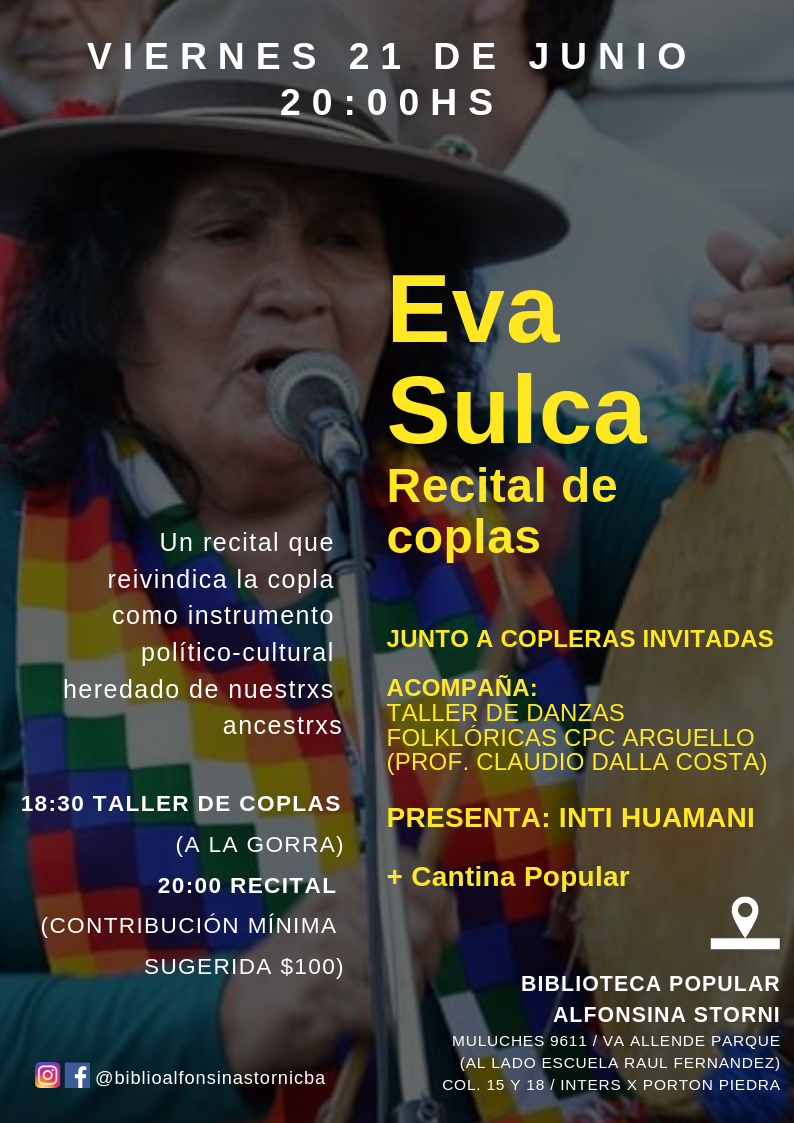 Eva Sulca, la coplera Salteña radicada en Córdoba, brindará un taller de coplas a partir de las 18:30 (entrada a la gorra), para luego -a partir de las 20:00- ofrecer un recital junto a invitadas y el taller de danzas folclóricas del CPC Argüello (contribución mínima sugerida).