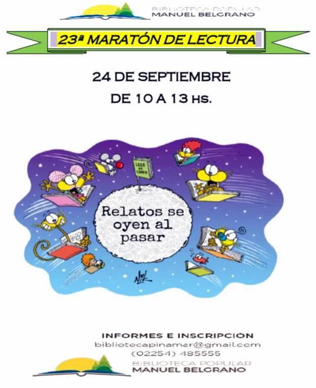 La Maratón de Lectura es una tradicional campaña anual de promoción del libro y la lectura. Este año se desarrollará el 24 de septiembre con el lema "Relatos se oyen al pasar. ... La literatura en boca de todos, y se constituirá en una nueva celebración para comunicar la importancia de la lectura .