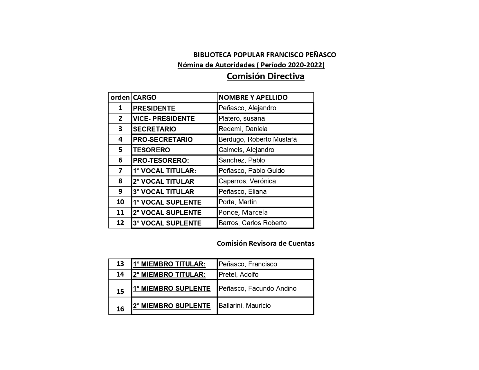 La Biblioteca Popular "FRANCISCO PEÑASCO", realizó anoche la ASAMBLEA GENERAL ORDINARIA mediante plataforma informática (Google Meet) con gran participación de sus Asociados, en la misma se aprobó el ejercicio económico 2019 y se renovó la Comisión Directiva y Revisora de cuentas por el periodo 2020-2022, la que quedó conformada según planilla adjunta. La nueva Comisión Directiva saluda y agradece a los Socios por la confianza depositada.