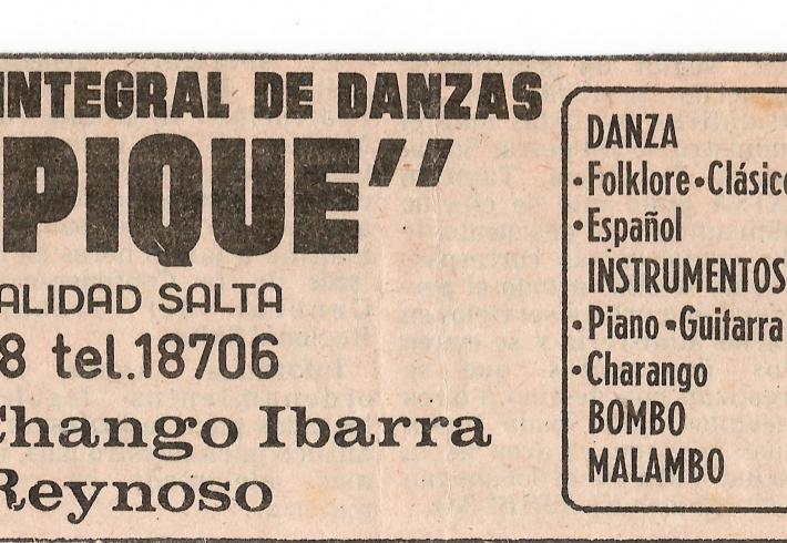 “Por las aulas” Perfeccionamiento Docente. – 1984/87 dentro del marco de promoción de la cultra regional, el Consejo Gral de de Educación, organizó cursos de folclor destinado a docentes de distintas zonas del interior de la provincia, cuyos responsables son los docentes Nena Reynoso y El Chango Ibarra.