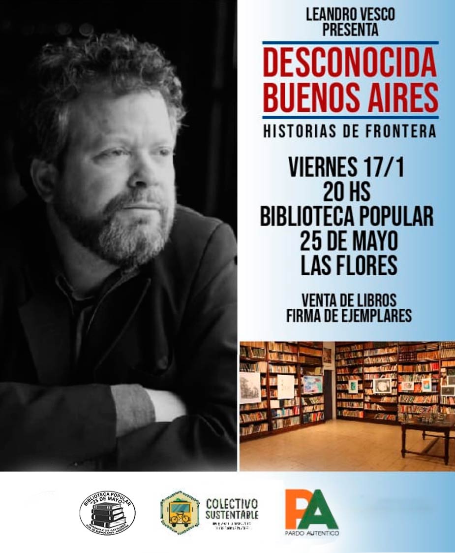 La Comisión Directiva de la Biblioteca Popular "25 de Mayo", invita a la presentación del libro "Desconocida Buenos Aires" un hermoso y entrañable trabajo de Leandro Vesco. La misma tendrá lugar en la sede de la Biblioteca, viernes 17 de enero a las 20 horas.