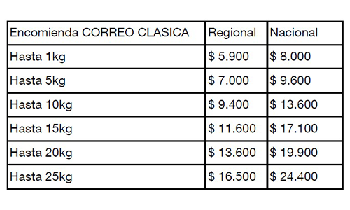 Precios unitarios finales de encomiendas nacionales y regionales (con IVA)